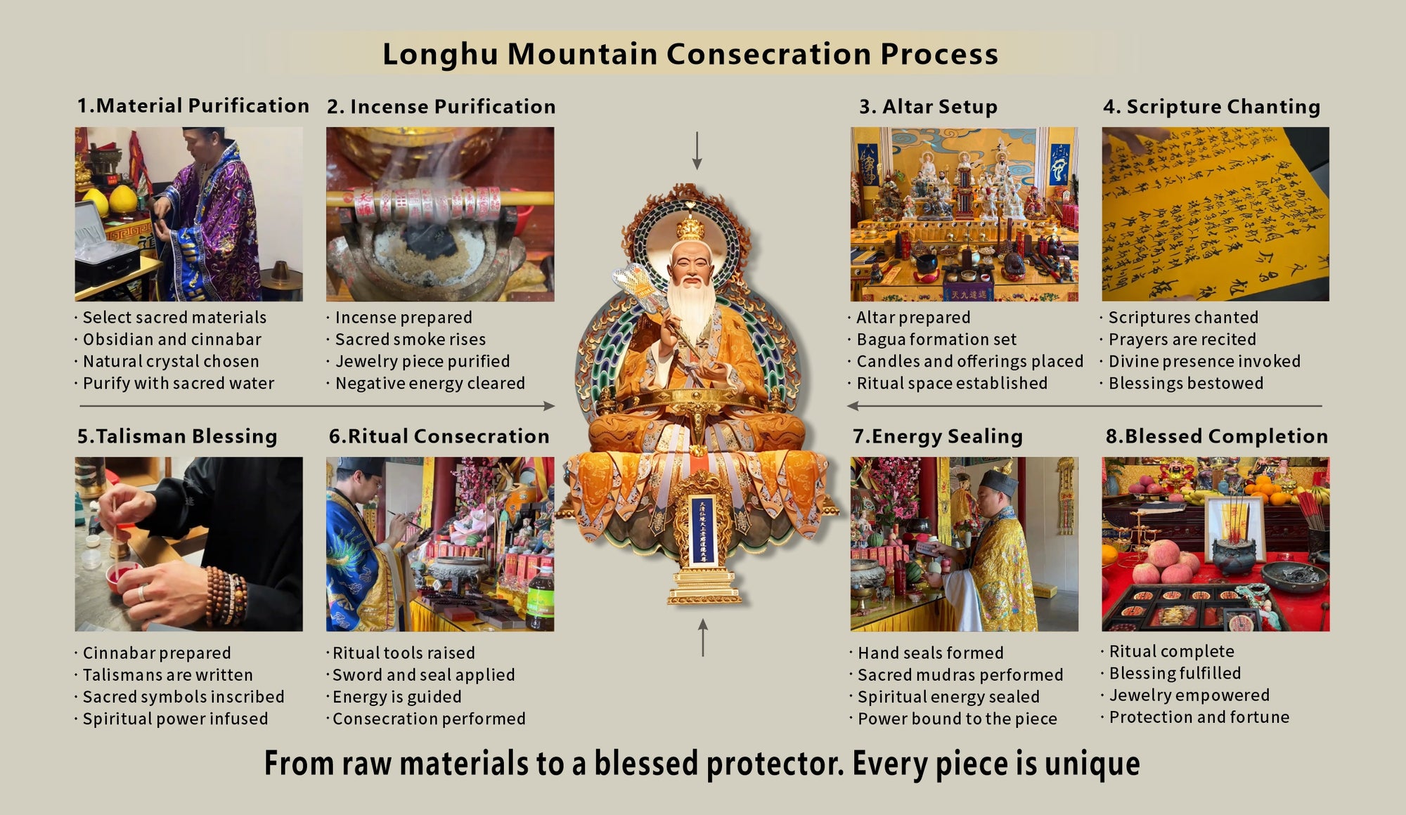 Because each item must undergo the authentic Kaiguang (energy infusion) blessing ritual at Longhu Mountain in China before shipping, we need 3-5 business days to: